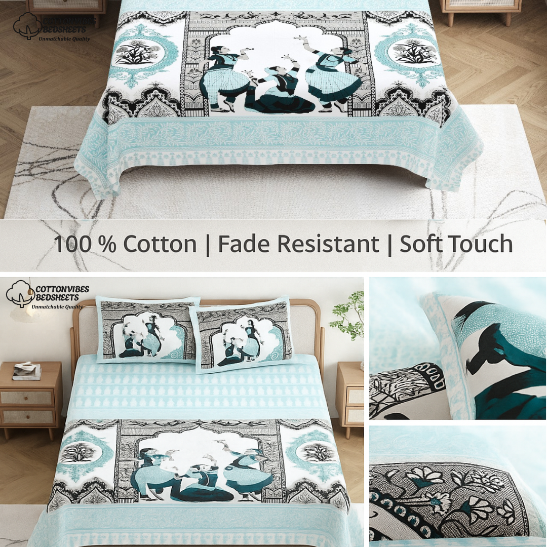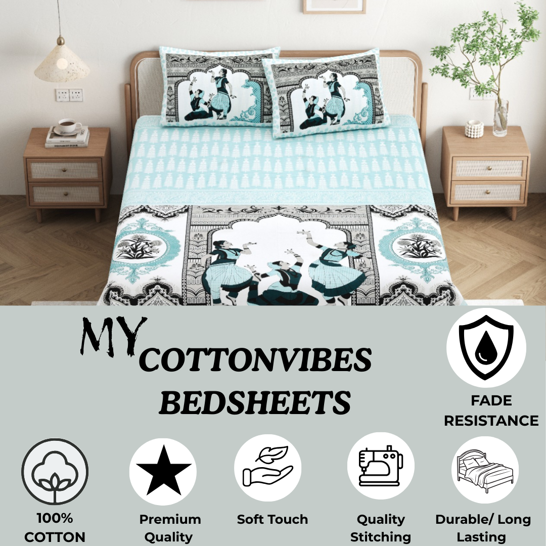 Cotton Vibes Pure Cotton King Size Bedsheets (90x108) with 2 Pillow Covers – Add elegance to your bedroom with the Chitrakala Collection, crafted from 100% pure cotton. Soft, breathable, and durable, this designer bedsheet is perfect for daily use, home décor, or gifting.