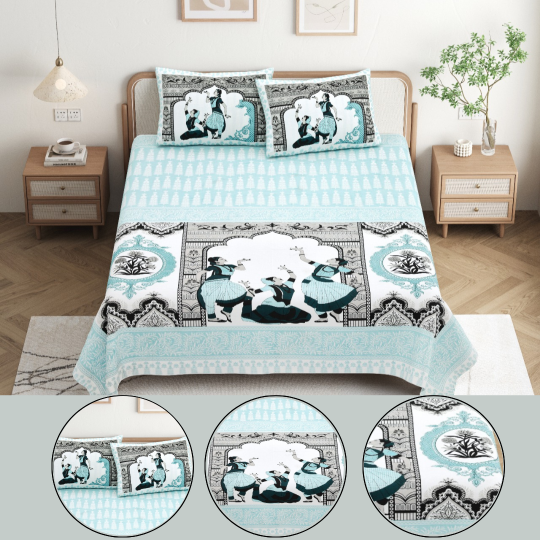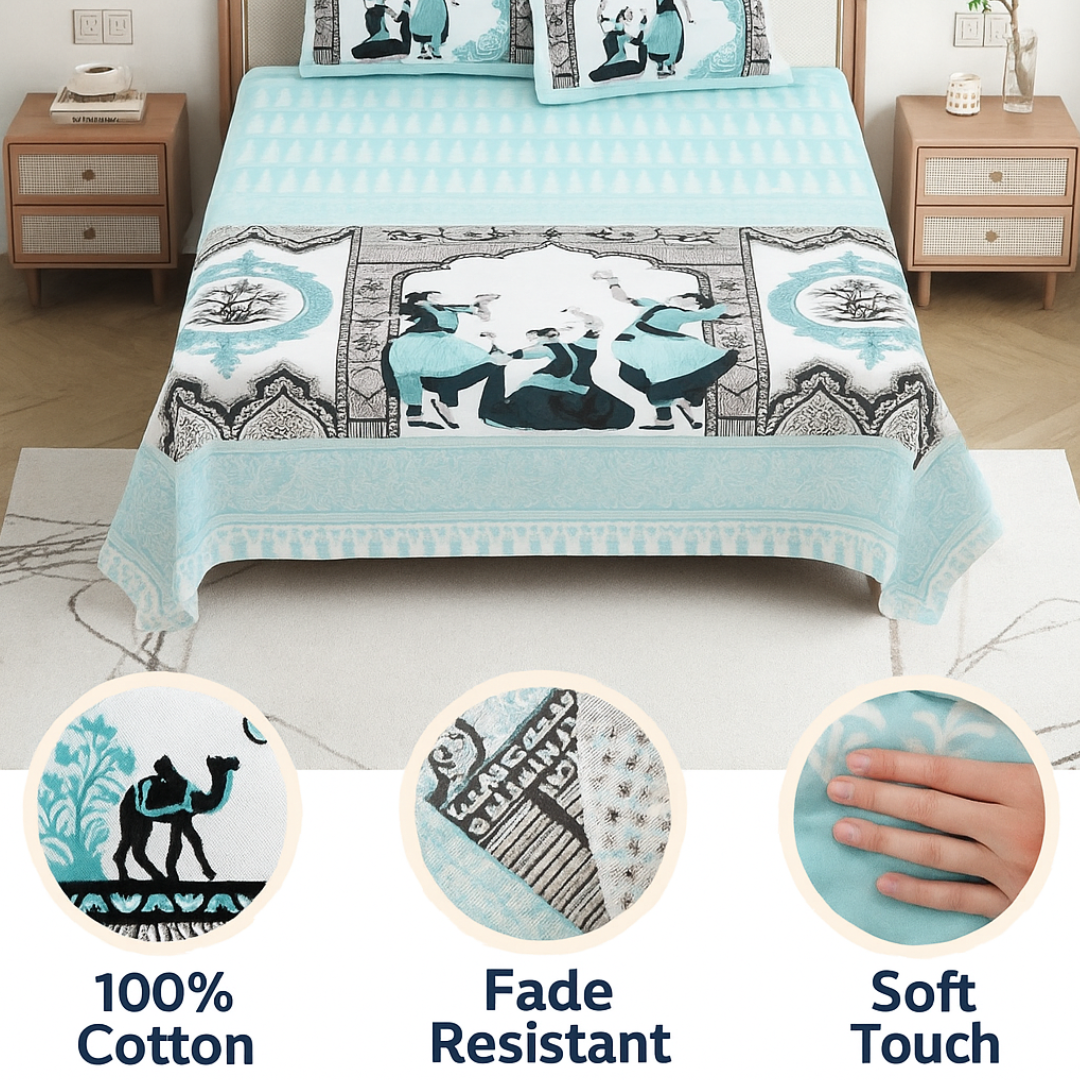 Made in India with premium Jaipuri-inspired prints, our bedsheets combine tradition with modern style. The set includes 2 matching pillow covers (18x28 inches) that complete the look. With fade-resistant colors and strong stitching, Chitrakala bedsheets stay vibrant and fresh even after multiple washes.